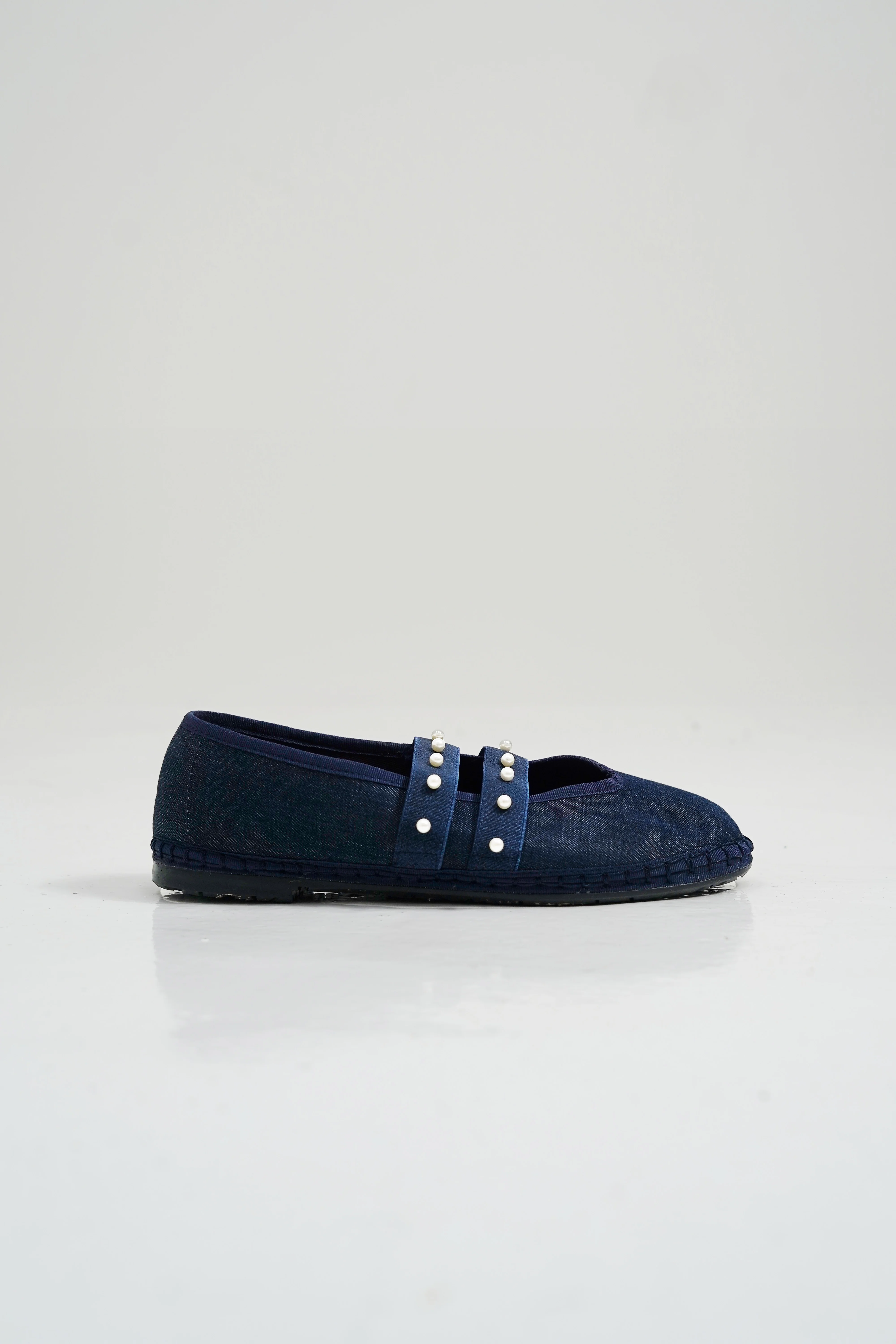 Bailarinas en tejido denim con detalle de tiras del mismo tejido decoradas con perlas. Diseño exclusivo de la colaboración Sophie and Lucie x Flabelus, para tus looks de día o de invitada.