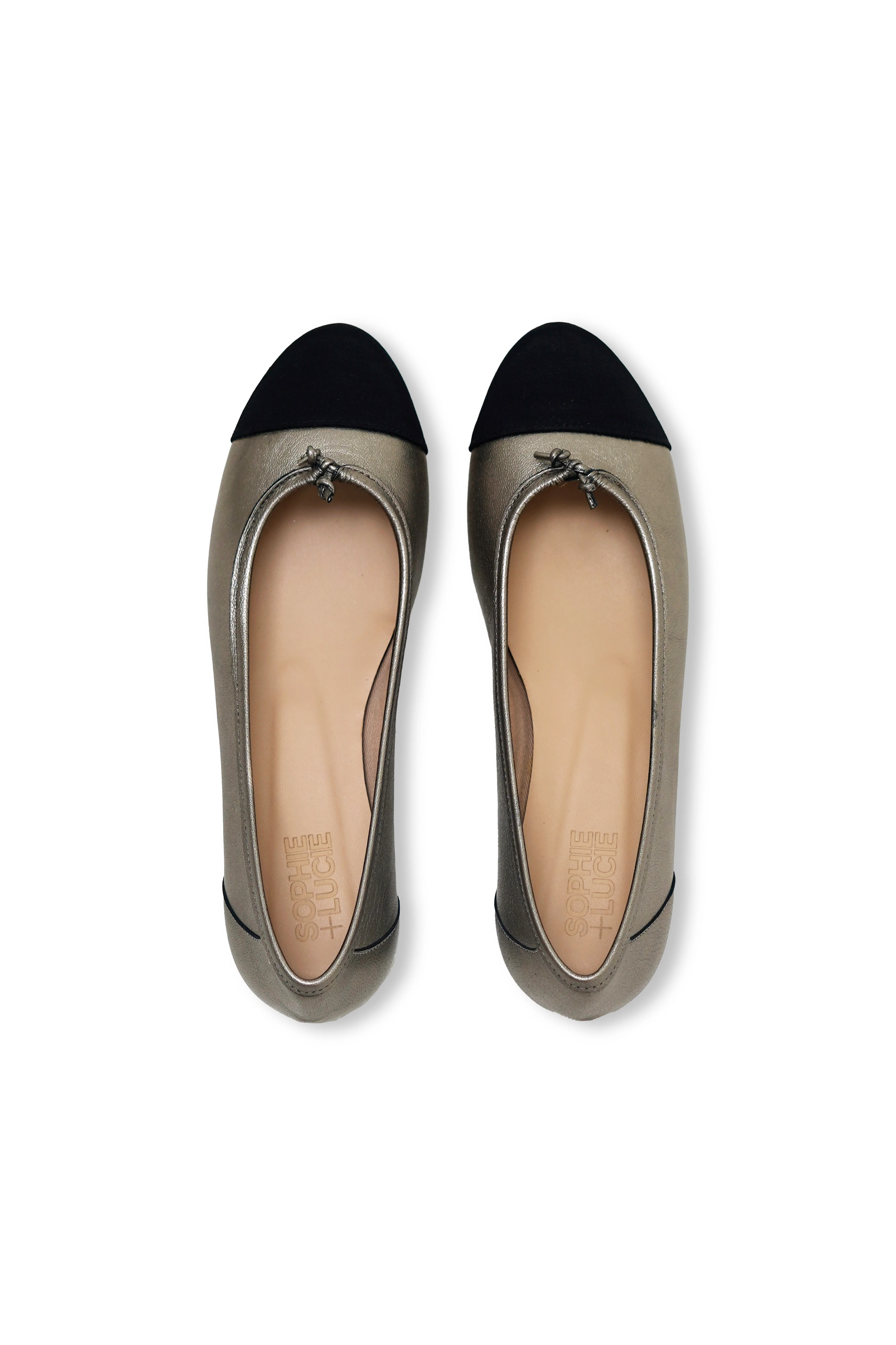 Bailarinas clásicas bicolor. Cuerpo en tono plateado puntera redonda con tejido a contraste negro. Detalle de pequeño lazo en la parte frontal.
