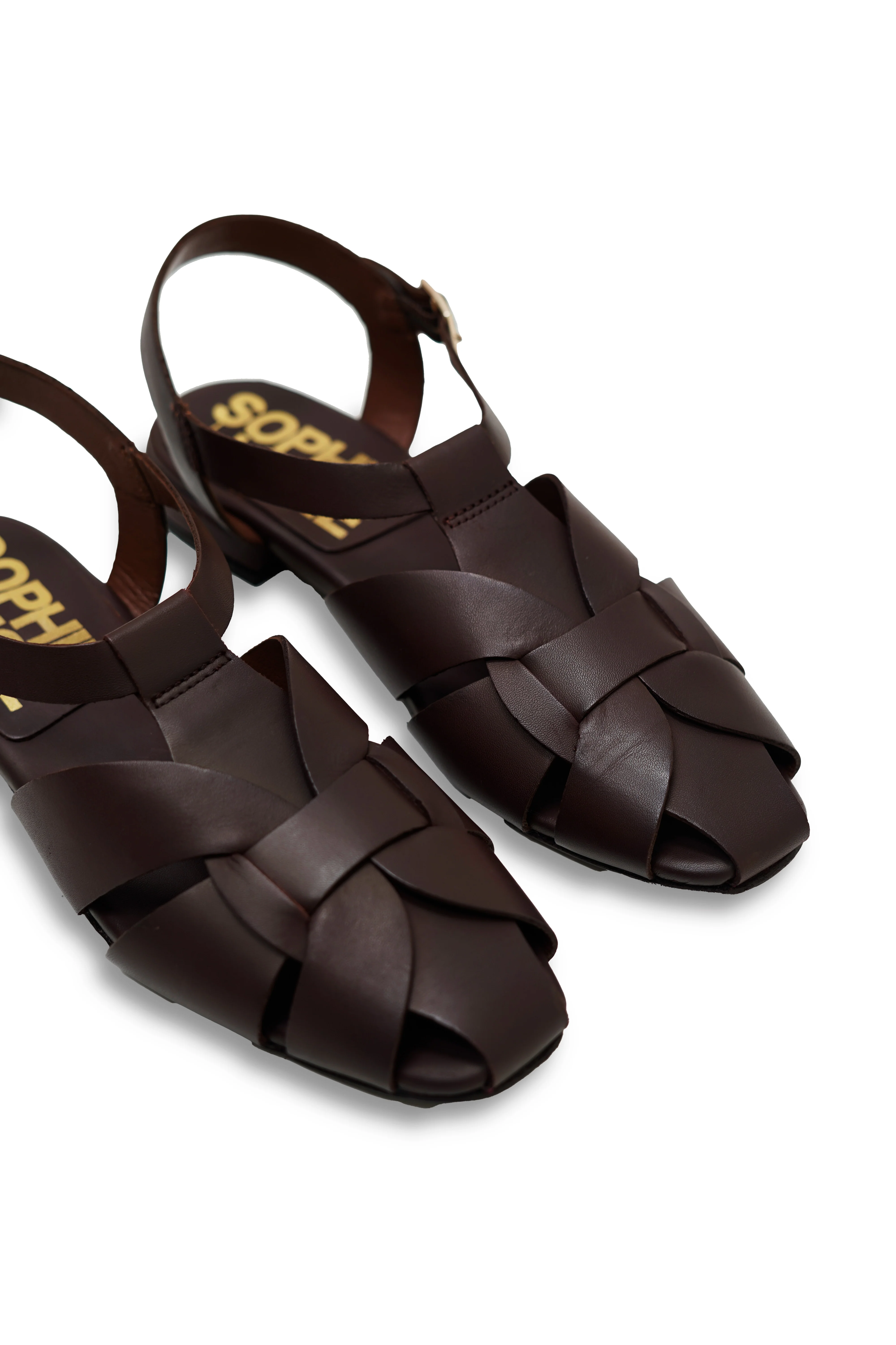 Sandalias cangrejeras de piel marrón con tiras cruzadas y cierre de hebilla. Comodidad y estilo clásico para tus looks de verano.