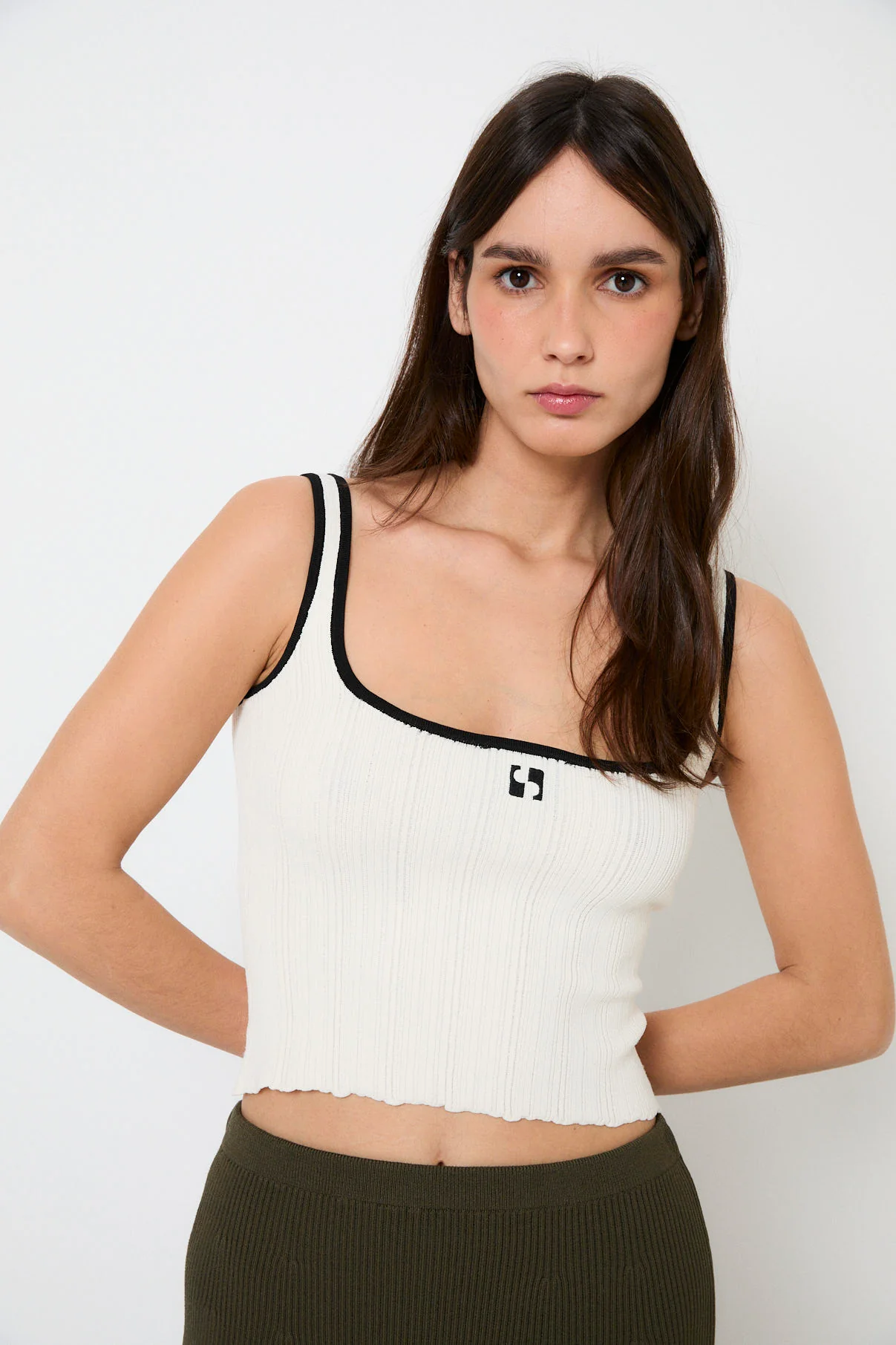 Top de punto canalé en color crudo con detalles en negro. Diseño ajustado con escote redondo pronunciado y tirantes finos. Logotipo de S&L en la parte frontal.