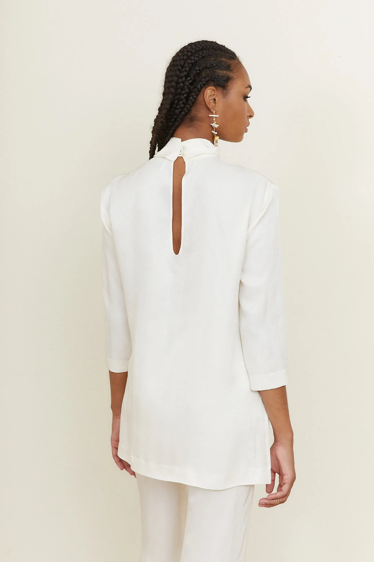 Túnica fluida confeccionada en tejido de viscosa en color crudo. Túnica con cuello chimenea y cierre trasero con botones. Manga tres cuartos y aberturas laterales para dar movimiento. Con posibilidad de ajustarla con nuestro fajín.