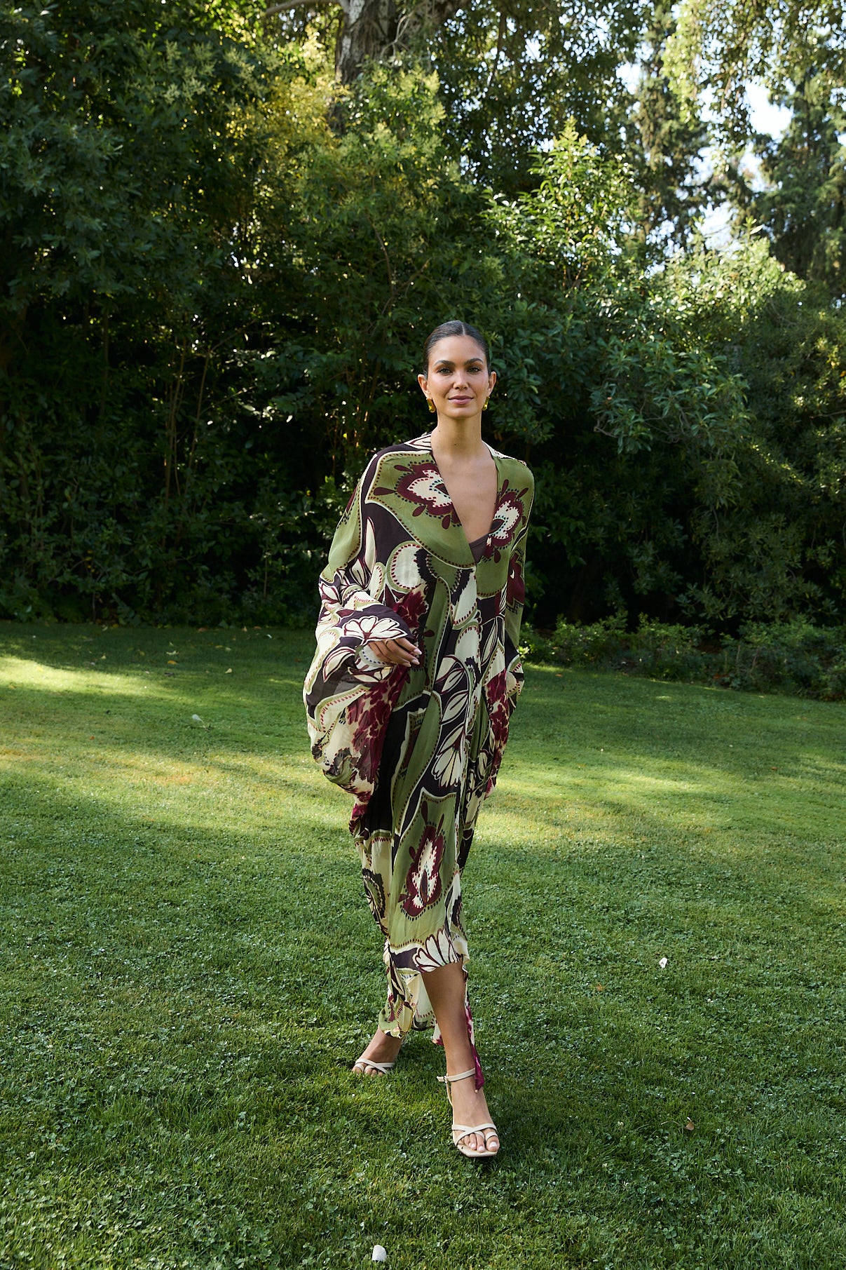 Vestido largo y fluido con estampado floral en tonos verde oliva, frambuesa, marfil y negro. Presenta un escote en pico profundo y mangas amplias tipo murciélago, que aportan movimiento. El tejido ligero y vaporoso realza la silueta y lo convierte en una prenda ideal para ocasiones especiales.